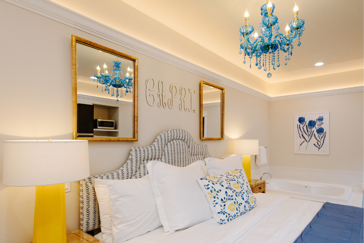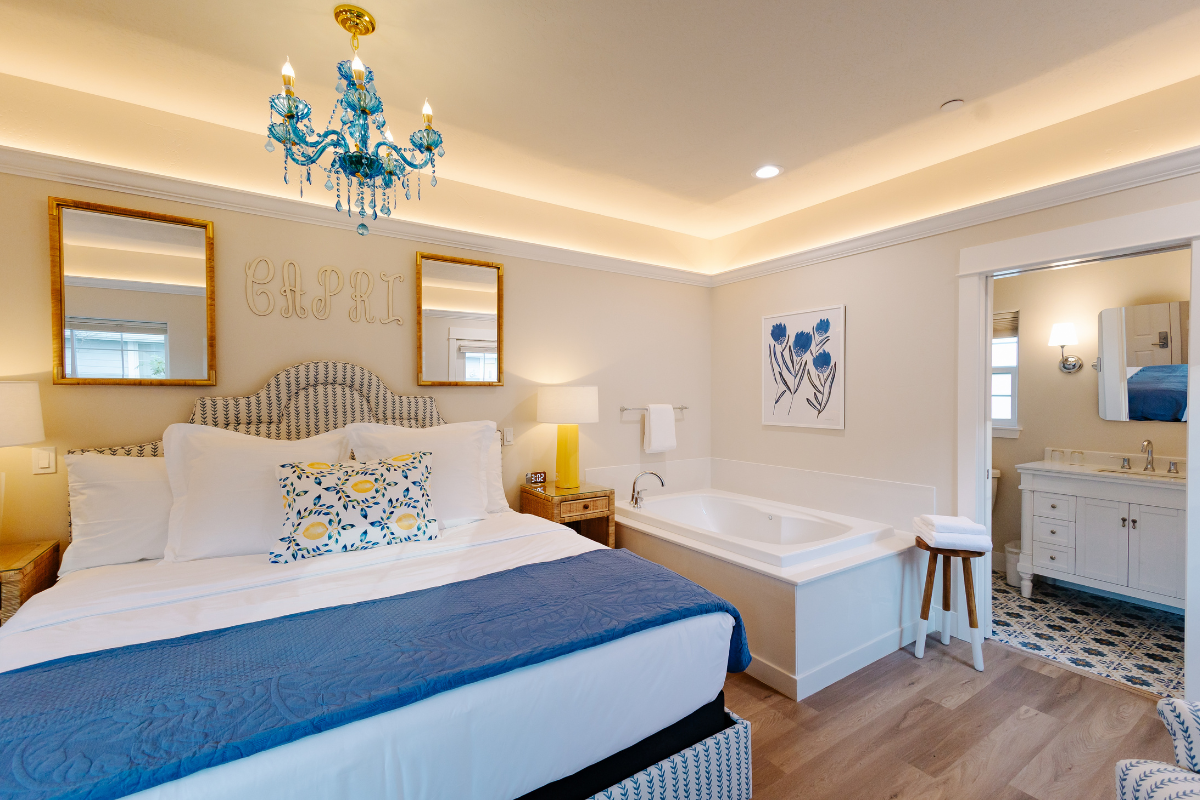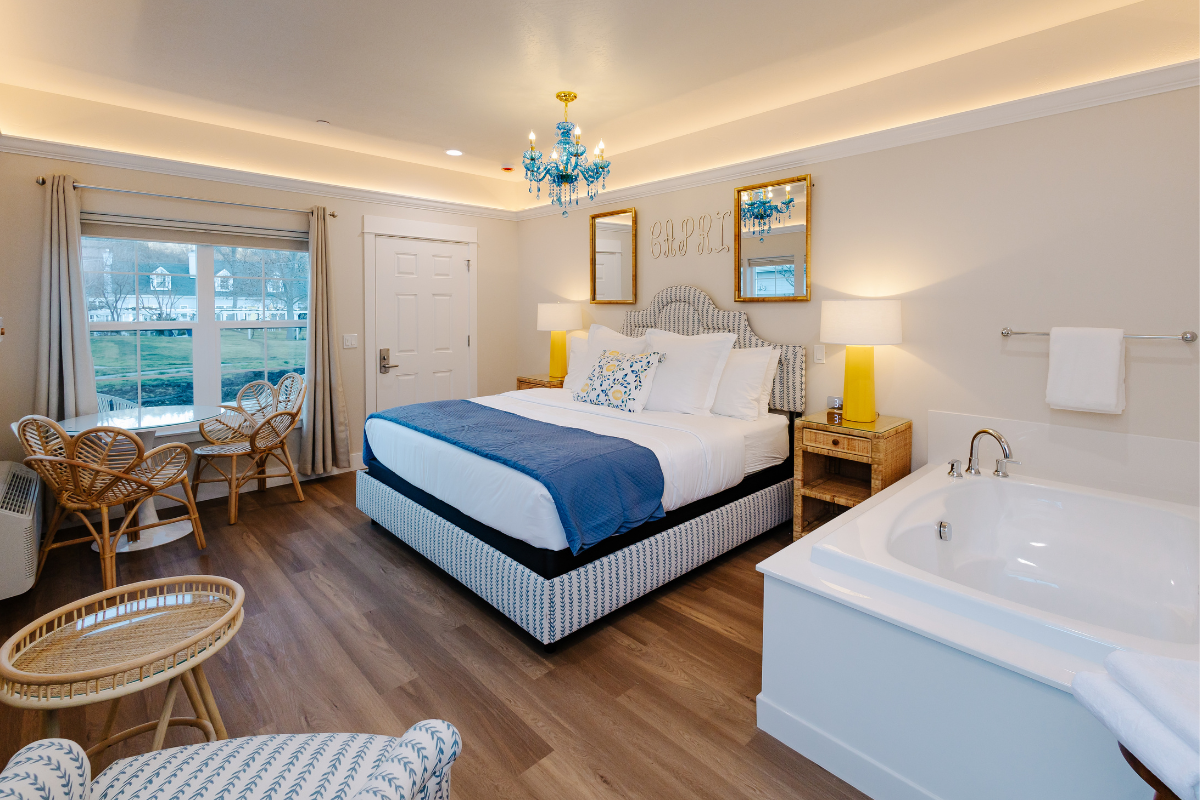 Inspired by the sun-washed beauty of the Amalfi Coast and the tranquil nature of Lithia’s mineral springs, the Capri Bungalows offer a serene, European-influenced escape designed for rest and renewal. These charming king studio bungalows feature a fresh, coastal palette and thoughtful details that evoke calm—from the soft glow of a blue crystal chandelier inspired by our natural mineral waters to the warmth of a cozy fireplace.