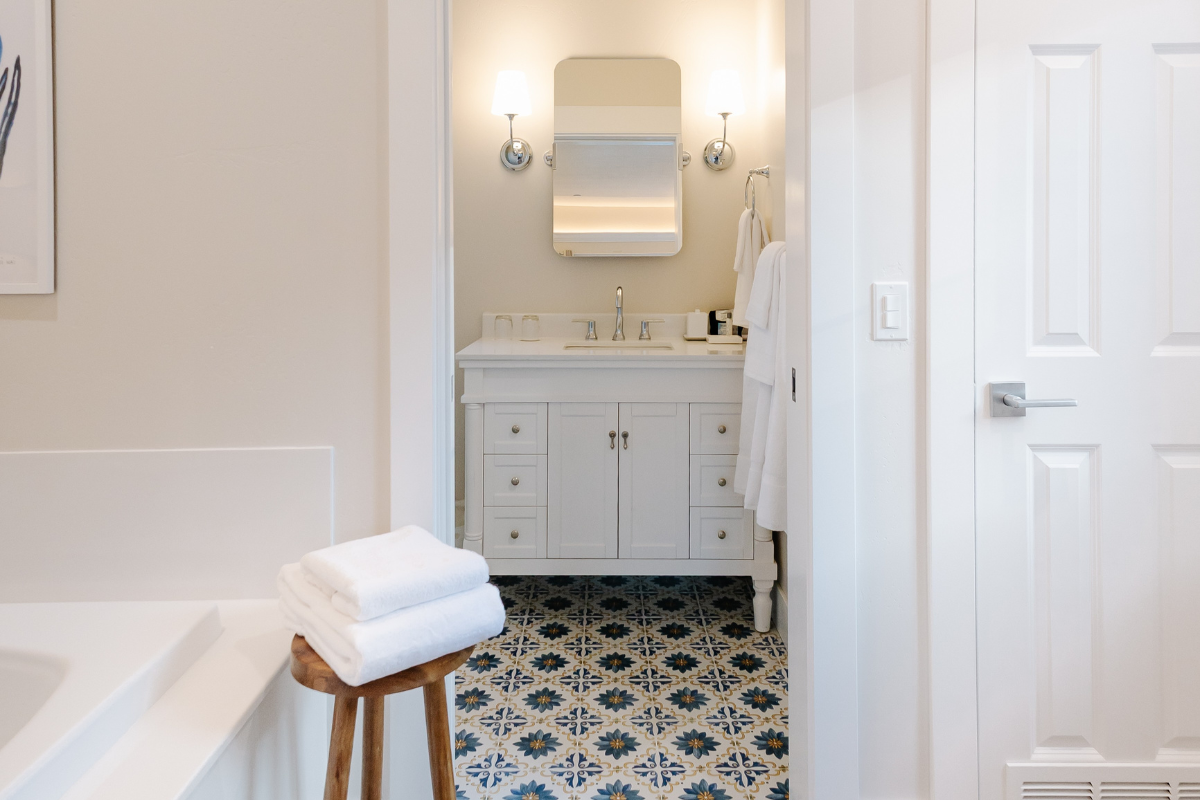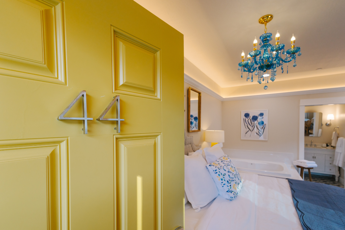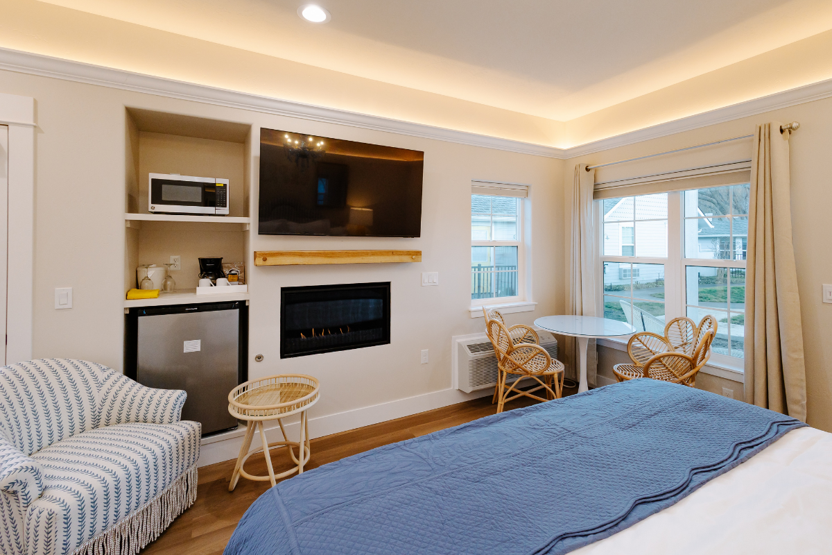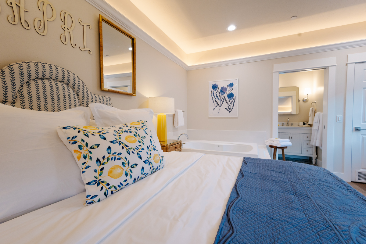 Inspired by the sun-washed beauty of the Amalfi Coast and the tranquil nature of Lithia’s mineral springs, the Capri Bungalows offer a serene, European-influenced escape designed for rest and renewal. These charming king studio bungalows feature a fresh, coastal palette and thoughtful details that evoke calm—from the soft glow of a blue crystal chandelier inspired by our natural mineral waters to the warmth of a cozy fireplace.